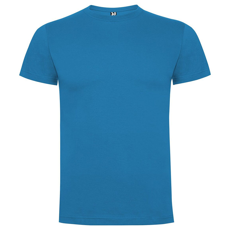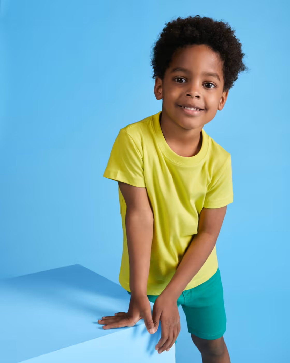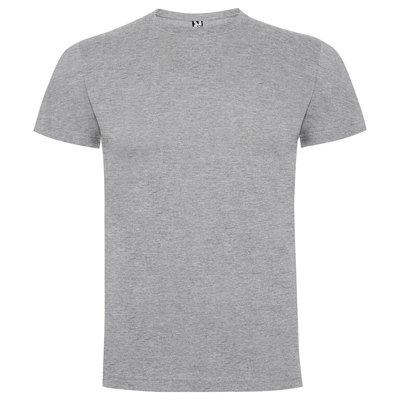 Camiseta de manga corta. Cuello redondo de 4 capas en canalé 1×1 con cubrecosturas de hombro a hombro. Costuras laterales.